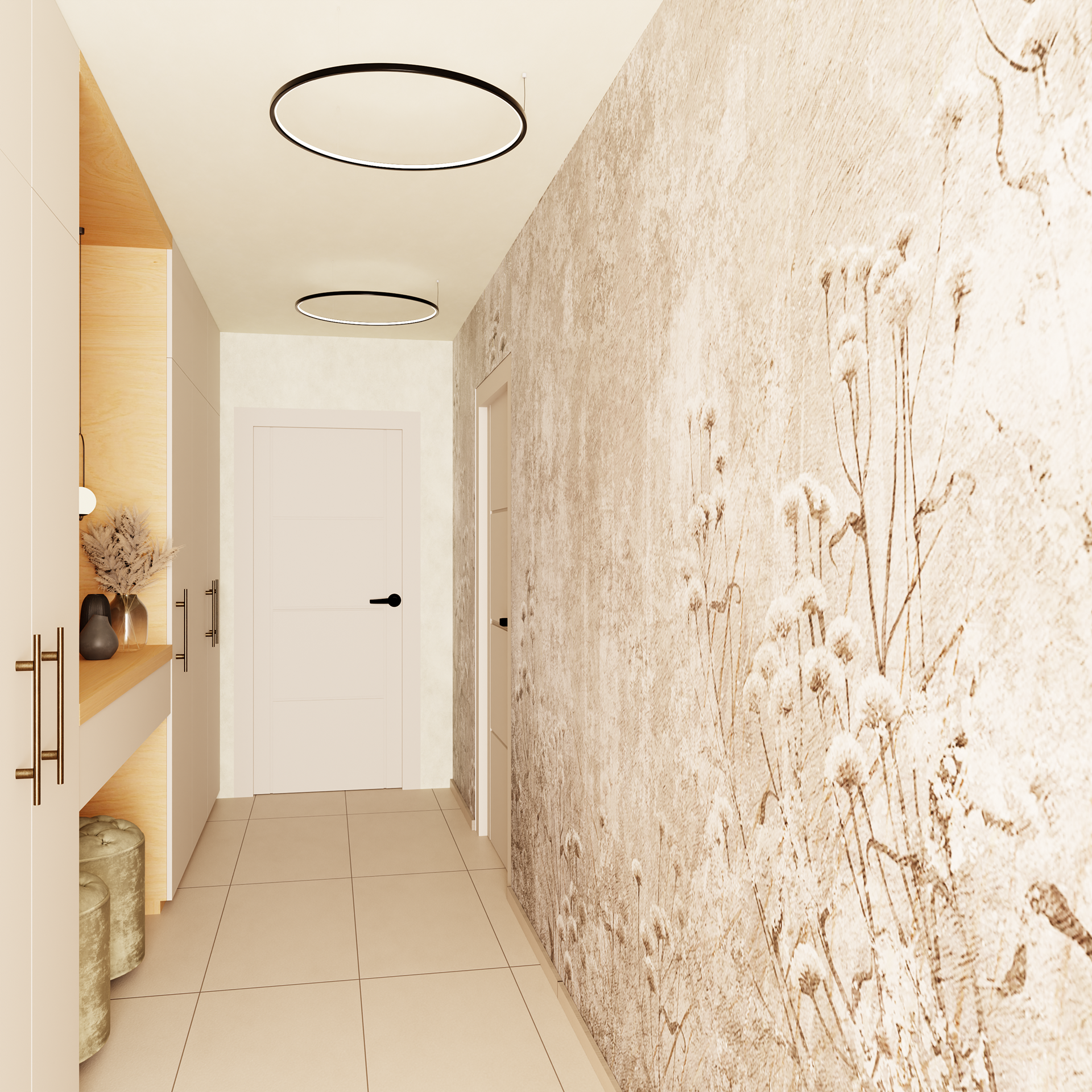 Chodba je navržená tak, aby byla praktická, ale nepůsobila tvrdě ani chladně. Úložné prostory jsou součástí celku a výrazná tapeta prostor změkčuje, dodává mu teplo a atmosféru.
