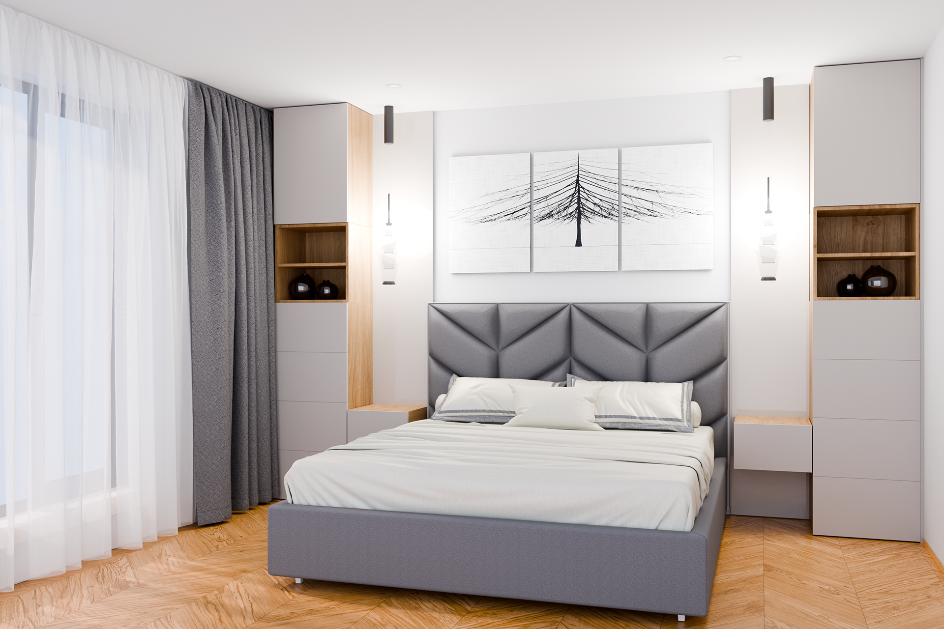 Návrh ložnice v neutrální šedobílé barevnosti doplněné o teplé dřevo.